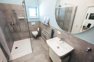 Das Bad verfügt über eine großzügige begehbare Dusche. Wir stellen Ihnen außerdem einen Föhn, Handtücher und eine Waschmaschine zur Verfügung.