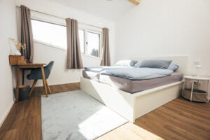 Die Ferienwohnung hat ein Schlafzimmer mit 17qm. Hier finden Sie ein Doppelbett vor mit hochwertigen allergikerfreundlichen Matratzen inklusive verschiedener Härtegrade und einen Schreibtisch.