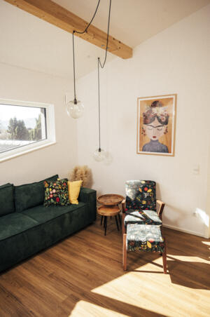 Ein Highlight der Wohnung ist der private Aussenbereich mit einer 10 qm grossen Sonnenterrasse mit Essbereich und Sonnenliege samt Bergpanorama und idyllischem Vogelgezwitscher.